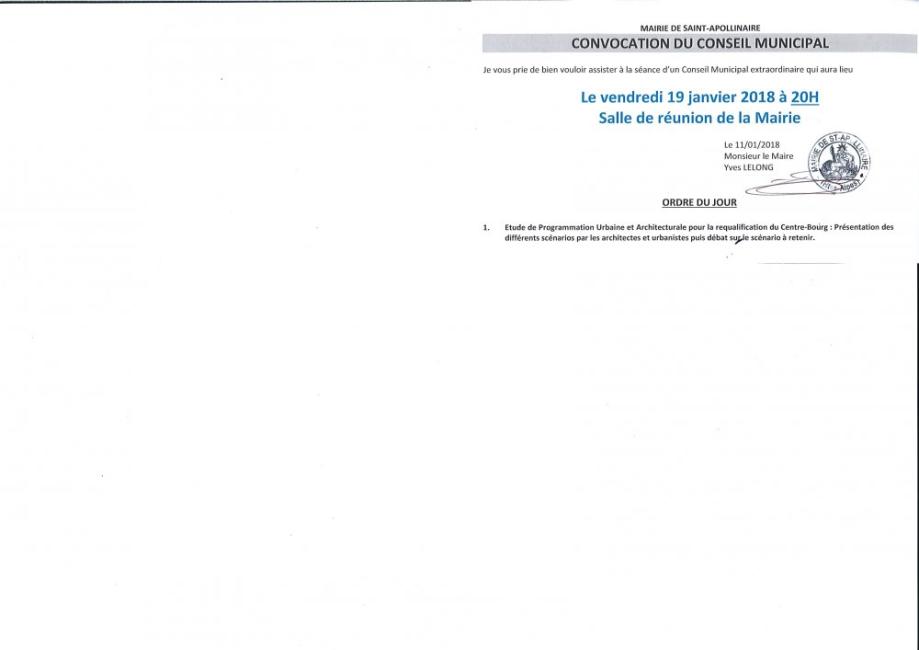 11 janvier 2018 Documents Document convocation Conseil Municipal extraordinaire du 19 janvier 2018 Infos pratiques Saint Apollinaire 04 92 44 22 33 Nous contacter A ne pas manquer Actualités Evénements