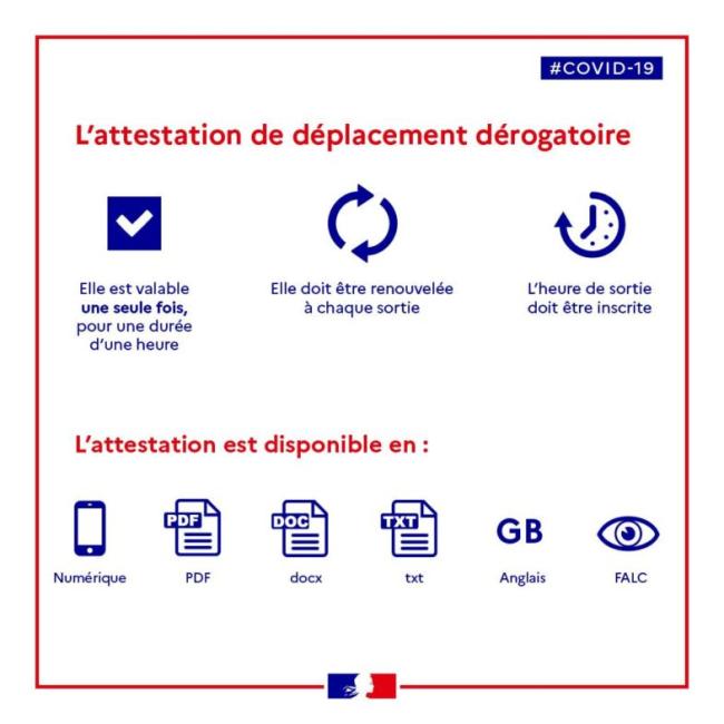 En cette période de confinement il est nécessaire de vous munir d'une attestation pour chacun de vos déplacements.