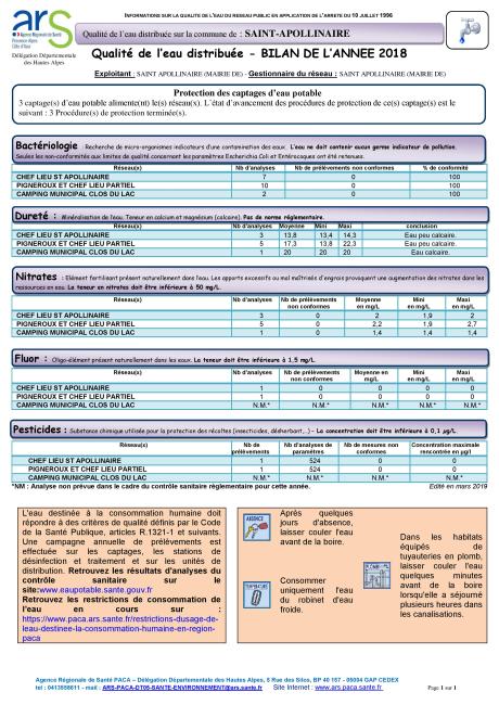 03 avril 2019 Documents Document Qualité de l'eau distribuée - bilan de l'année 2018 Infos pratiques Saint Apollinaire 04 92 44 22 33 Nous contacter A ne pas manquer Actualités Evénements